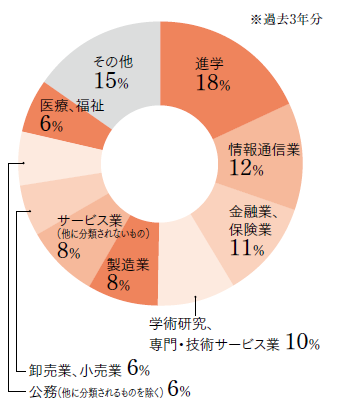 本学科の卒業生は、20%程度が大学院に進学し専門性を高め、臨床心理士などのカウンセラーを目指しています。大学院への進学以外にも、学びを生かして医療業界に進む人、IT 関連、金融や卸売・小売業界、法律事務所などで活躍する人など多種多様です。