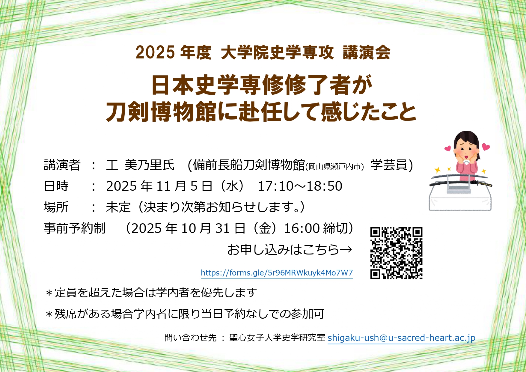 大学院修士課程史学専攻講演会「日本史学専修修了者が刀剣博物館に赴任して感じたこと」
