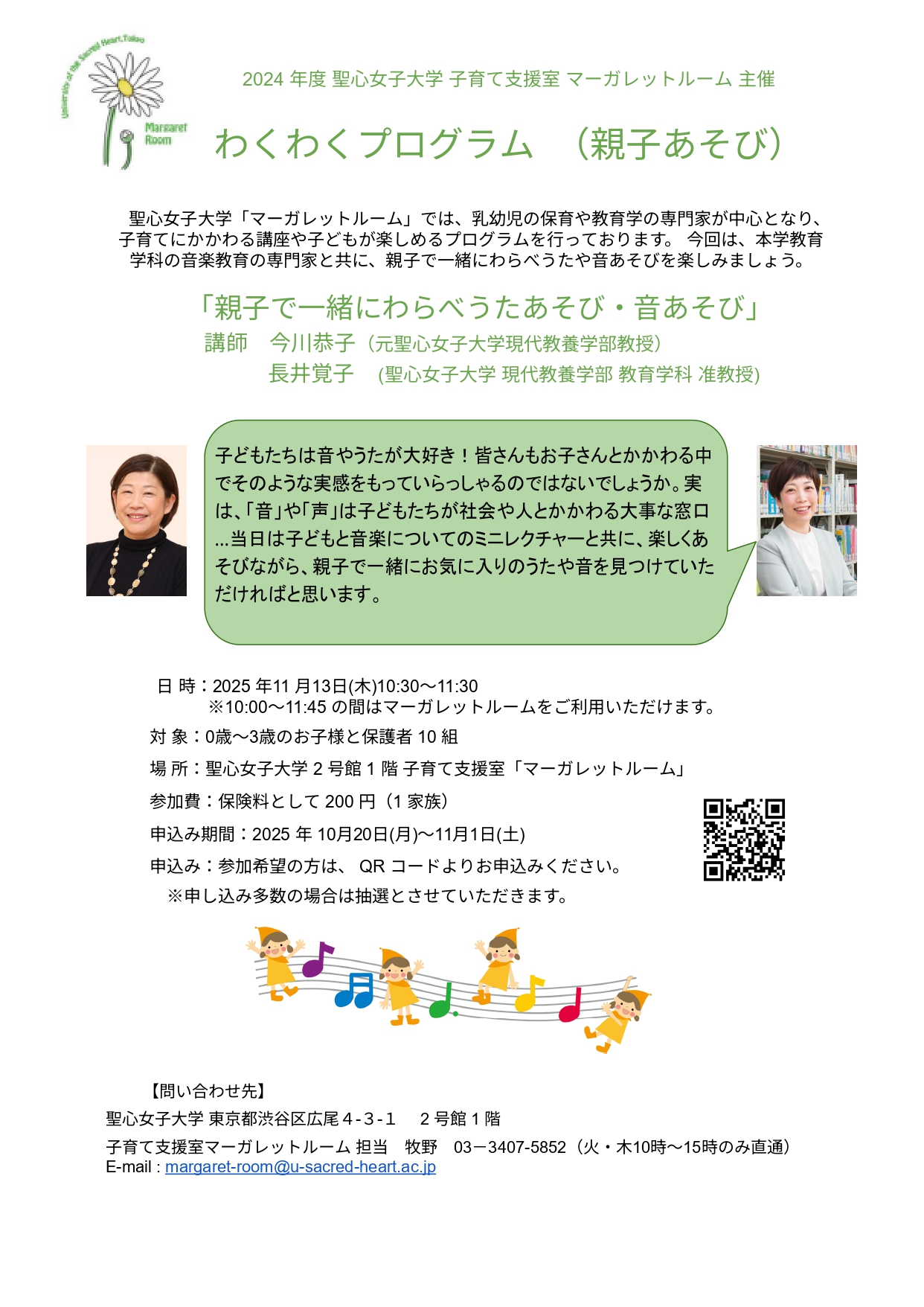 子育て支援室「マーガレットルーム」では、乳幼児の保育や教育学の専門家が中心となり、 子育てにかかわる講座や子どもが楽しめるプログラムを行っております。 今回は、本学教育学科の音楽教育の専門家と共に、親子で一緒にわらべうたや音あそびを楽しみましょう。