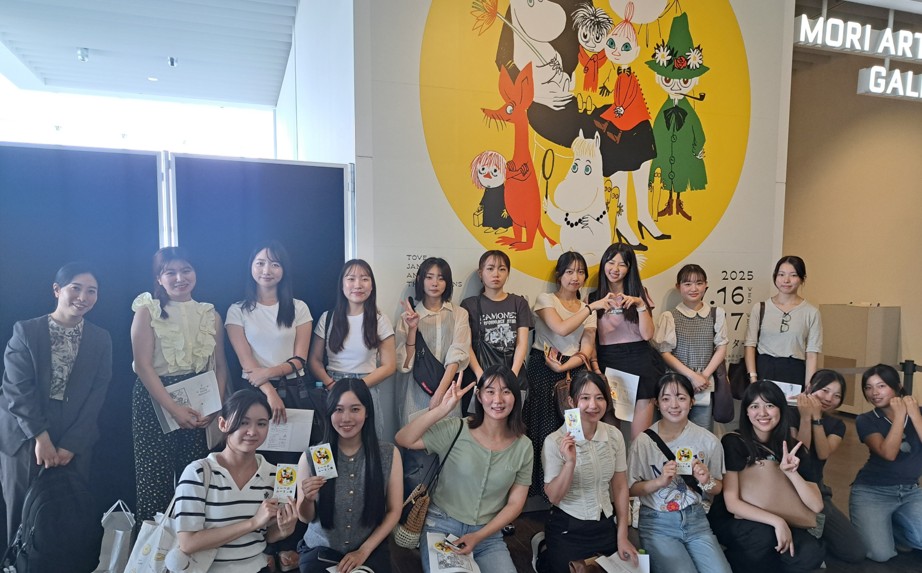 翌9日には、ヤンソン作品への理解をさらに深めるために、森アーツセンターギャラリー開催の展覧会「トーベとムーミン展~とっておきのものを探しに~」を訪れました。展覧会の図録には安達まみ学長によるヤンソン氏と世界文学をめぐる論文が掲載されており、本学哲学科名誉教授冨原眞弓先生の翻訳されたヤンソン作品を手にする学生の姿もありました。参加者のひとりは「作品の背景にある人間関係や交流の広がりを知ることができ、これまで以上にトーベ・ヤンソンさんの人物像やムーミンの作品に親しみを覚えると同時に、創作を支える人とのつながりの大切さにも気づかされ、学びや気づきの多い時間となりました」と報告しています。