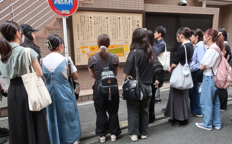 史学科の集中講義「日本史フィールドワーク1」の最終日、学生18名が学外研修に参加し、千住宿の踏査を行いました。「日本史フィールドワーク1」(授業担当:古畑侑亮先生)は、最近の旅行史の研究動向を踏まえて江戸時代に書かれた紀行文を紐解くとともに、旅文化を支えたインフラの歴史を学ぶことで、近世社会についての理解を深めることを目指した授業です。