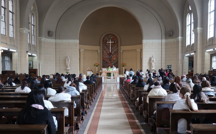 11月27日(木)、聖マグダレナ・ソフィア聖堂では、菊地枢機卿様と石脇神父様の共同司式による学生ミサが行われ、約130名の学生・教職員が集い、心を合わせて祈りを捧げました。枢機卿様からは、クリスマスを迎えるこの季節にふさわしく、「希望」についてのお話がありました。暗闇の中に輝く光として来られたイエスは、まさに私たちの希望です。命の危機に直面し、希望が見えにくい今だからこそ、私たち一人ひとりが「命(いのち)」を大切にし、周囲の人々に希望を届けていく意義をお話しくださいました。
