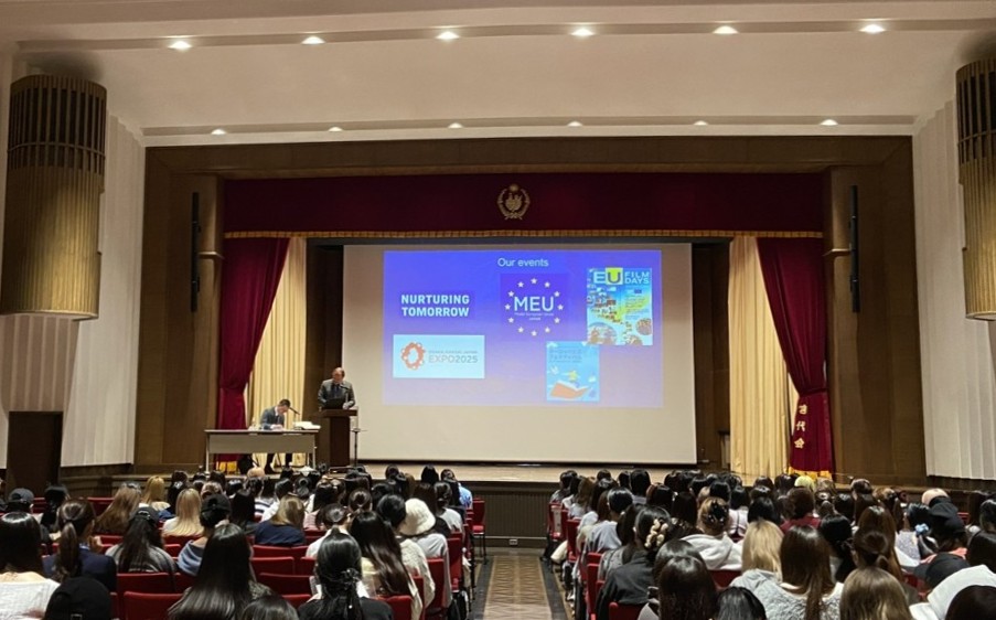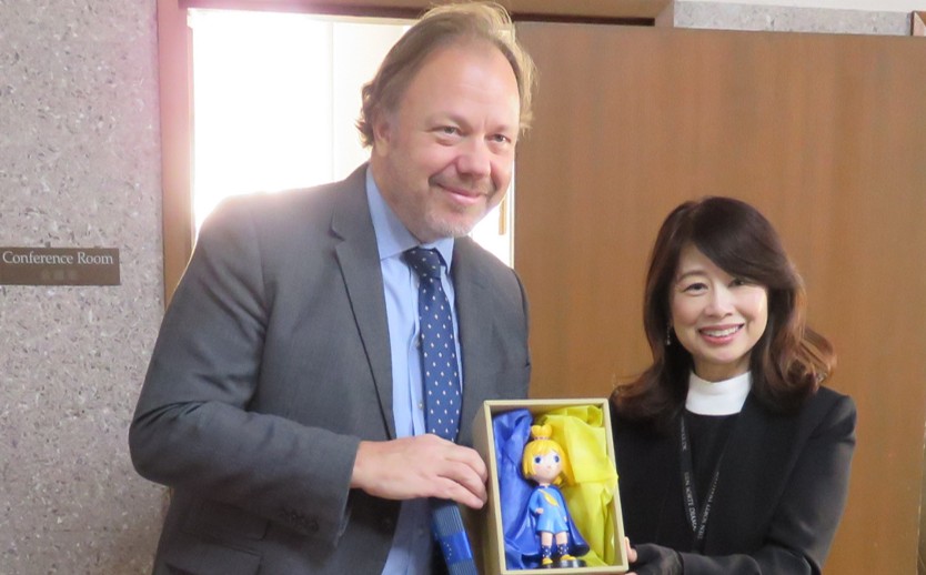 公使様によるご講演は「The EU in the World and EU-Japan Relations (世界の中のEU、そしてEUと日本の関係)」と題され、EUの歴史、世界におけるEUの役割、そして日本との協力や交流について、パワーポイントを用いて詳しく解説してくださいました。講演終了後学生からの質問にも丁寧にお答えくださり、EUに関心を持つ本学の学生たちに、今後欧州連合代表部への訪問の機会もいただけることになりました。