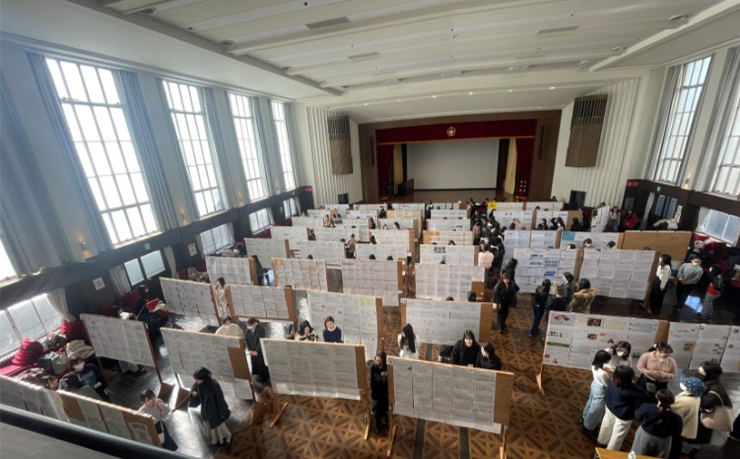 人間関係学科では、全学生が参加する卒業論文発表会・社会調査実習報告会を今年も開催しました。卒業論文を提出した4年次生全員と社会調査実習を受講している3年次生が、それぞれの研究の成果をポスターにまとめてパネルに掲示し、教員と学生の間で熱心な質疑応答が行われました。